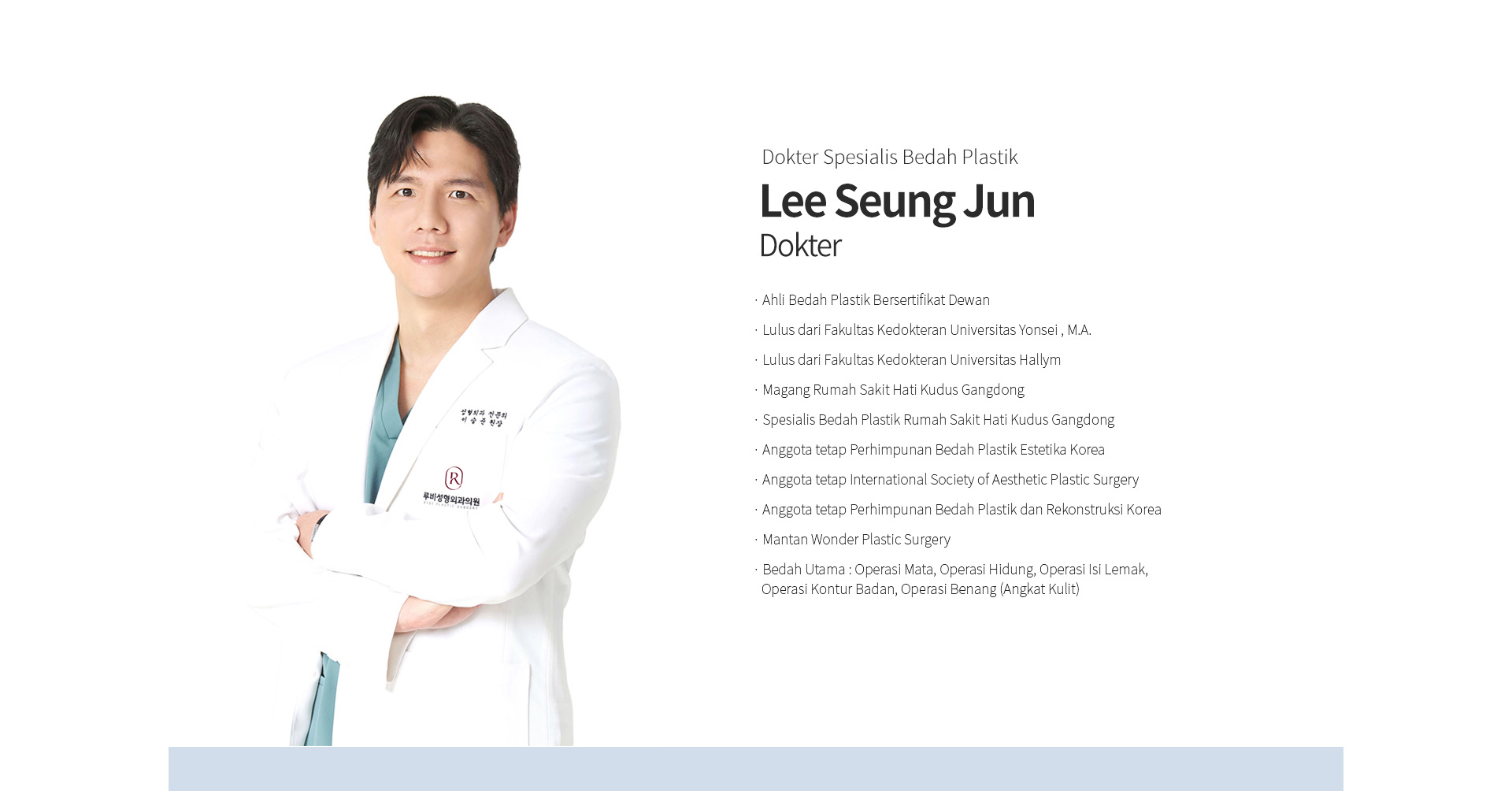 Daya Saing Ruby Klinik Bedah Plastik Ruby menghasilkan hasil yang berbeda dengan kebanggaan dan teknologi yang luar biasa untuk operasi plastik! Daya Saing Inti RUBY Klinik Bedah Plastik Ruby mengutamakan keselamatan pasien dan menghargai komunikasi dengan pelanggan untuk meningkatkan kepuasan pasien. la juga menghadirkan kecantikan yang cocok untuk setiap pasien dan menyediakan layanan medis yang selalu dapat dipercayai oleh pasien. Ketera m pilan yang Berbe Hasil yang Berbeda The Korean Association of Plastic Surgeon Dengan RUBY, anda menjadi lebih istimewa! Di Klinik Bedah Plastik Ruby, staf medis profesional dengan pengalaman yang kaya berkomunikasi dengan pasien melalui konseling jujur dan formal, menganalisis pasien secara akurat, dan menemukan kecantikan mereka sendiri dengan rencana yang disesuaikan secara mendetail. Klinik Bedah Plastik Ruby akan melakukan teknik medis yang memberi nilai tambah bagi kehidupan sekaligus kecantikan. Sekarang, Klinik Bedah Plastik Ruby adalah yang anda butuhkan! Refresh PLASTIC SURGERY UBY Unique Beauty Young Itu membuat anda merasakan kegembiraan hidup baru Kami akan membantu anda menemukan nilai anda sendiri Naikkan standar kecantikan ke tingkat berikutnya Membuat anda menjadi lebih muda dari luar ke dalam kulit RUBY PLASTIC SURGERY Specialist Medical Team 01 Pelanggan 1:1, layanan bedah plastik yang disesuaikan oleh staf medis khusus di lapangan Ahli bedah plastik, petit & kulit dan ahli anestesi yang terampil akan melakukan yang terbaik untuk memastikan hasil yang memuaskan anda. #Sistem medis yang disesuaikan secara sistematis #Layanan medis berorientasi pelanggan dengan kepuasan tinggi 02 Pembentukan sistem medis khusus untuk setiap mata pelajaran bedah plastik Staf medis dengan pengalaman yang kaya bertanggungjawab atas segalanya mulai dari konsultasi hingga operasi dan manajemen pasca operasi. #Dokter spesialis bedah plastik #TIDAK! Dokter Bayangan, Bedah Hantu ! 03 Konsultasi langsung dan jujur berdasarkan kepercayaan dengan pelanggan Melalui konsultasi yang memadai, kami dengan hati-hati menganalisis gejala pelanggan saat ini dan hanya menyarankan operasi yang benar-benar dibutuhkan pelanggan tanpa perawatan berlebihan. #Rencana khusus pelanggan 1:1 #Hasil Bagus, Kepuasan Tinggi оц Tanggungjawab atas hasil operasi! Sistem jaminan kewajiban operasi 1 tahun Kami mengincar hasil terbaik, tetapi jika operasi revisi kadang-kadang diperlukan, operasi revisi gratis akan dilakukan dalam waktu 1 tahun sesuai kesepakatan dengan tim medis. Masalah yang disebabkan oleh kelalaian pelanggan tidak berlaku. #Revisi kelopak mata ganda gratis dalam 1 tahun #Tanya kami untuk operasi lainnya 05 Upaya pembedahan yang aman penetapan sistem keselamatan yang menyeluruh Klinik Bedah Plastik Ruby dilengkapi dengan peralatan dan sistem keamanan yang menyeluruh untuk persiapan menghadapi keadaan darurat yang tidak terduga. #Defibrilator jantung #Sistem bertenaga sendiri (UPS) #Peralatan penyelamatan darurat #Pelatihan tanggap darurat 06 Sistem anestesi yang aman oleh spesialis anestesiologi Spesialis anestesi memeriksa keadaan anestesi pasien secara waktu nyata untuk memastikan operasi yang aman. #Pemantauan kondisi anestesi secara waktu nyata #Catat status anestesi pasien per menit Sistem manajemen pasca operasi yang lebih menyeluruh Berbagai perawatan pasca operasi disediakan untuk pemulihan cepat setelah operasi. Ini juga meminimalkan ketidaknyamaan yang disebabkan oleh operasi. #Manajemen Laser & Frekuensi Radio #Manajemen bekas luka & injeksi bekas luka 07 Kontrol kontaminasi ruang operasi dan pemasangan CCTV Ruang operasi selalu dijaga kebersihannya, dan dipasang CCTV di seluruh ruang operasi. #Sistem Pemurni Udara Ruang Operasi #Merekam seluruh proses pembedahan dengan memasang CCTV Daya Saing RUBY Klinik Bedah Plastik Ruby menghasilkan hasil yang berbeda dengan kebanggaan dan teknologi yang luar biasa untuk operasi plastik!